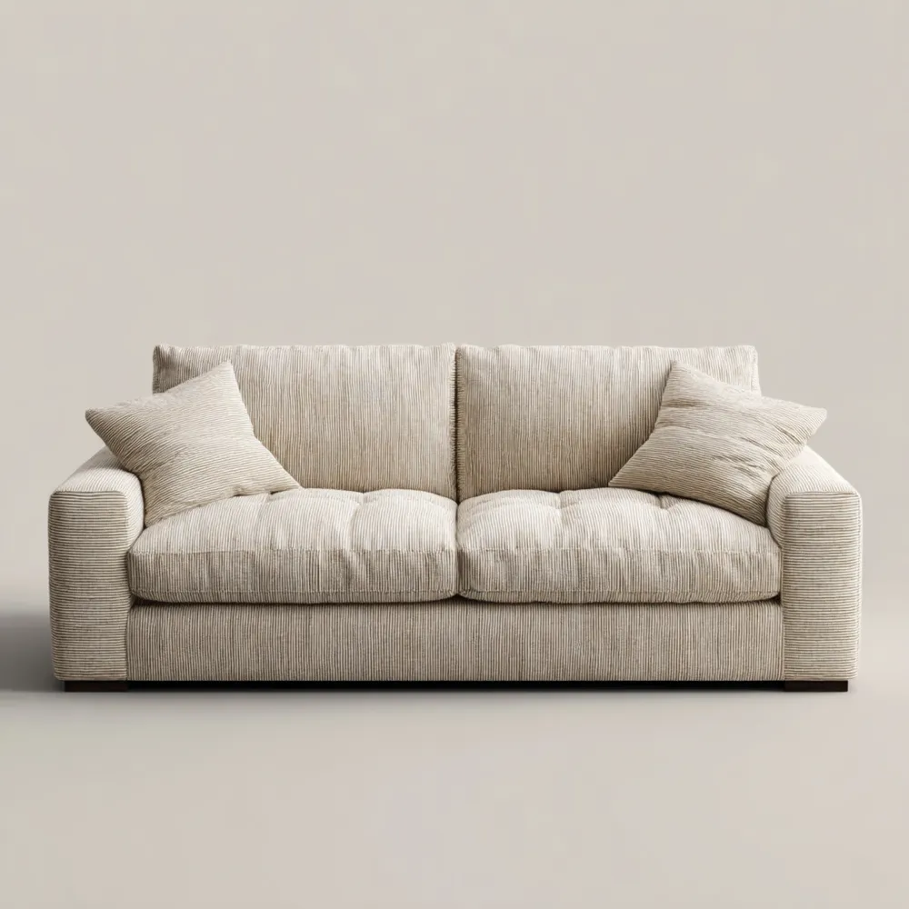 Material und VerarbeitungDas Sofa ist mit einem hochwertigen Stoffbezug in Beige gefertigt, der angenehm weich und langlebig ist. Die stabile Holzstruktur sorgt für eine langanhaltende Nutzung.