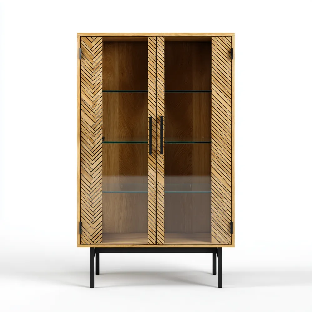 Material & VerarbeitungGefertigt aus massivem Naturholz mit einer klaren Glasfront, die eine elegante und zeitlose Optik bietet. Die Struktur wird von einem robusten Metallrahmen unterstützt.